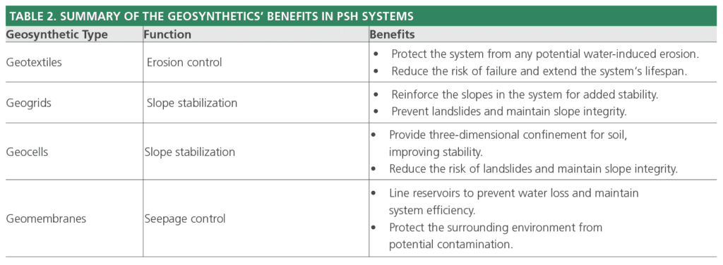 - Geosynthetics can help to reduce maintenance costs, extend the lifespan of PSH systems, and maintain their structural integrity by providing erosion control, slope stabilization, and seepage control.