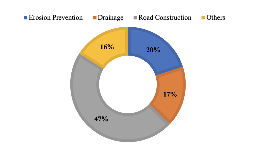 Geotextiles are polymer-based fabrics widely used as separation, filtration, reinforcement, protection, and drainage solutions in many civil engineering projects, including road construction, drainage systems, soil stabilization, and erosion control (11, 12). See Figures 1–3 for an overview of geotextile composition and typical applications.