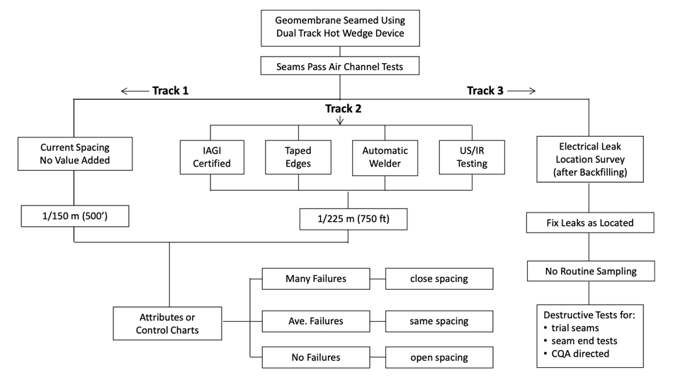 Modern recommendations for field testing seam integrity recognizes that different approaches can be taken based on welding practices. For example, utilizing certified installers, automatic welders, and other practices should mean less restrictive destructive seam testing intervals. If the standard destructive seam test interval for geomembranes is one sample per 500 ft, then the interval for a site that uses value-added practices could be one sample per 750 ft. Furthermore, using geomembranes that support testing using an electric leak location (ELL) method (ASTM D7240-18) should require even fewer destructive tests. Figure 1 outlines three different field-testing tracks based on welding practices. Please note, site-specific regulations can require a particular strategy and leave no room for options or changes (2).