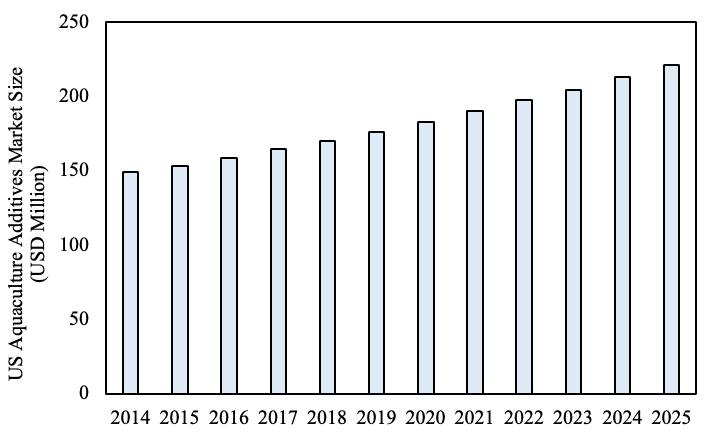 The demand for seafood in the United States has grown steadily over the years, with the country relying on imports to meet its demand. Domestic aquaculture production has also grown but has yet to keep up with demand (see growth by proxy via aquaculture additives in Figure 1 [6]). There is an opportunity to decrease reliance on foreign-farmed fish by developing domestic aquaculture. With U.S. population growth, changing dynamics with international trade, and a need to find sustainable protein sources, the role of aquaculture is clear (7, 8).