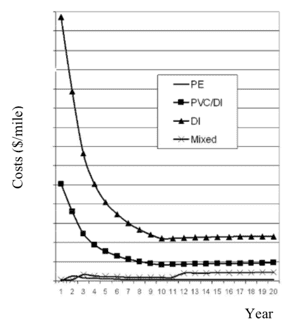 Now that the durability of HDPE has been established, it is important to describe how these properties affect the economics of using HDPE pipes for water infrastructure applications. The most obvious benefit of using HDPE pipes over PVC or ductile iron pipes is leak prevention. There are two types of leaks: Background leakage, which occurs mainly through pipe joints and perforations, and burst failure leakage, which is caused by longitudinal splits and circumferential breaks (1).