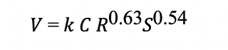First, pipes and fittings made with PE 100 have lower costs across their service life because the material does not corrode, rust, rot, pit, tuberculate, or support biological growth. Because the material is resistant to corrosion, it does not need to be replaced or maintained in the same manner as steel. Additionally, PE 100 has a lower pumping cost throughout its service life. Using the water flow equation, where V water velocity, k is the conversion factor, C is the roughness coefficient, R is the hydraulic, and S is the slope of the energy line, it becomes clear that C is one of the most significant variables when determining water flow—all other factors being equal.