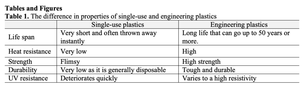 Single-use plastics are disposable solutions widely used daily for convenience at the cost of harming the environment by the resulting, long-term waste. On the other hand, engineering plastics provide high-performance capabilities to withstand various mechanical and environmental conditions. As a result, they can help create innovative solutions to evolve societies across all socioeconomic levels. Accordingly, this article intends to discuss the benefits and applications of engineering plastics and compare their properties against single-use variants.