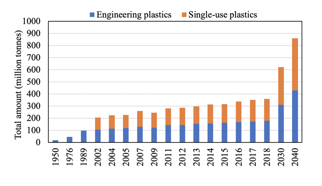 For decades, the global production of plastics has grown yearly by an average of 9% (1). Plastic production was reported as 1.7 million metric tons in 1950 (2), and this value reached 360 million metric tons worldwide in 2018 (3). The MacArthur Foundation estimated plastic production to double again over the upcoming two decades (4). Currently, plastics are categorized as single-use and engineering-use.